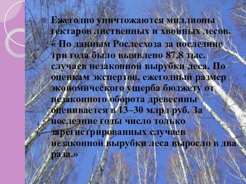 за последние три года было выявлено 87,8 тыс.случаев незаконной вырубки леса. По оценкам экспертов, ежегодный размер экономического ущерба бюджету от незаконного оборота древесины оценивается в 13–30 млрд руб. За последние годы число только зарегистрированных случаев незаконной вырубки леса выросло в два раза.»