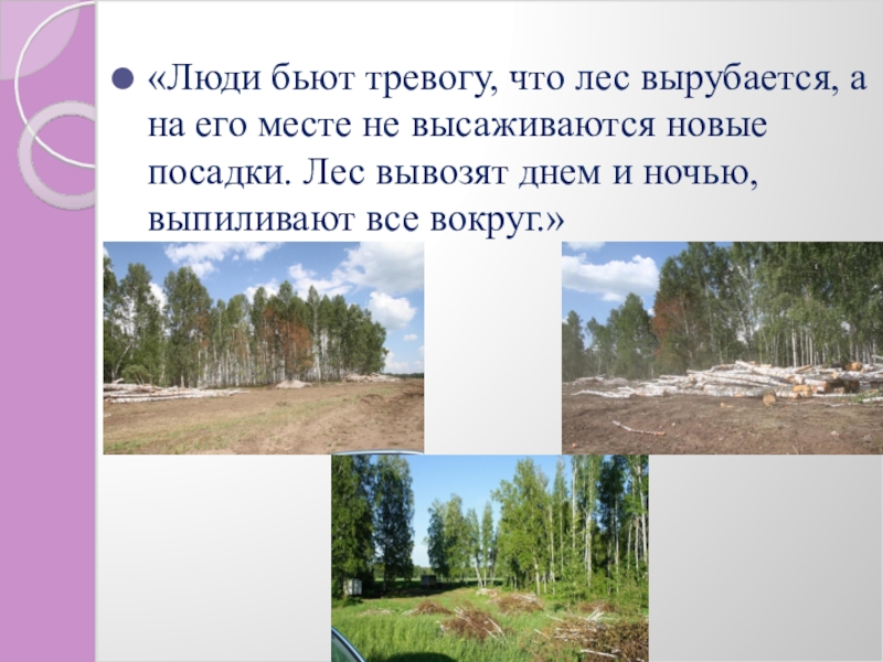 Слайд 4«Люди бьют тревогу, что лес вырубается, а на его месте не