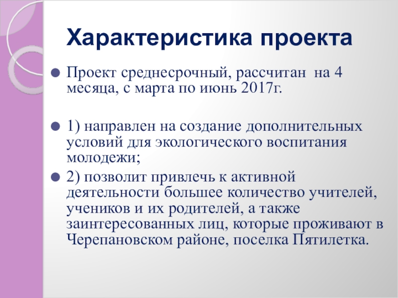 Проект среднесрочный, рассчитан на 4 месяца, с марта по июнь