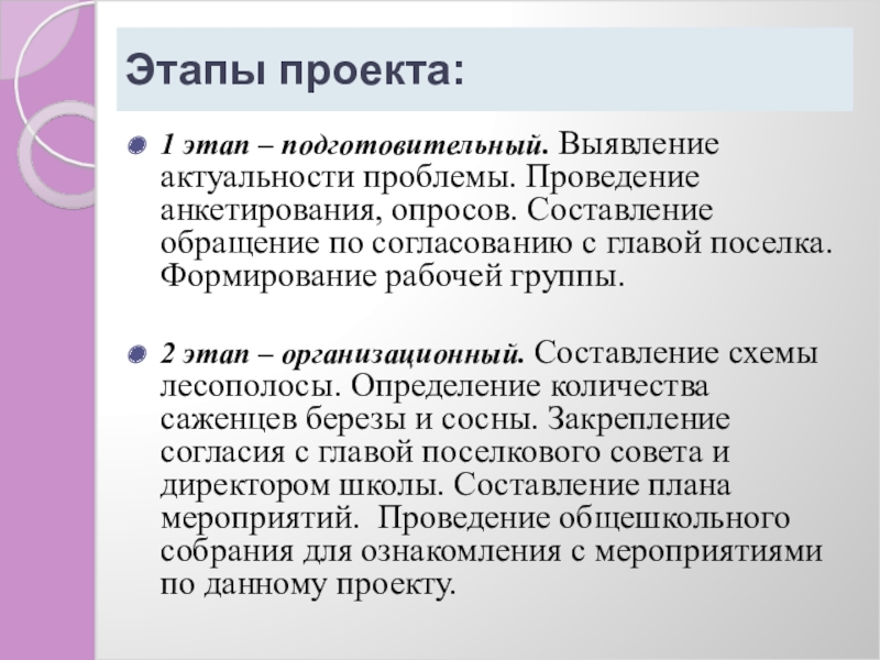 2 этап – организационный. Составление схемы лесополосы. Определение количества саженцев березы и сосны. Закрепление согласия с главой поселкового совета и директором школы. Составление плана мероприятий. Проведение общешкольного собрания для ознакомления с мероприятиями по данному проекту.