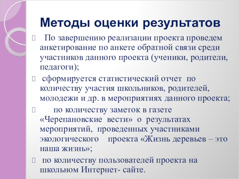 обратной связи среди участников данного проекта (ученики, родители, педагоги);