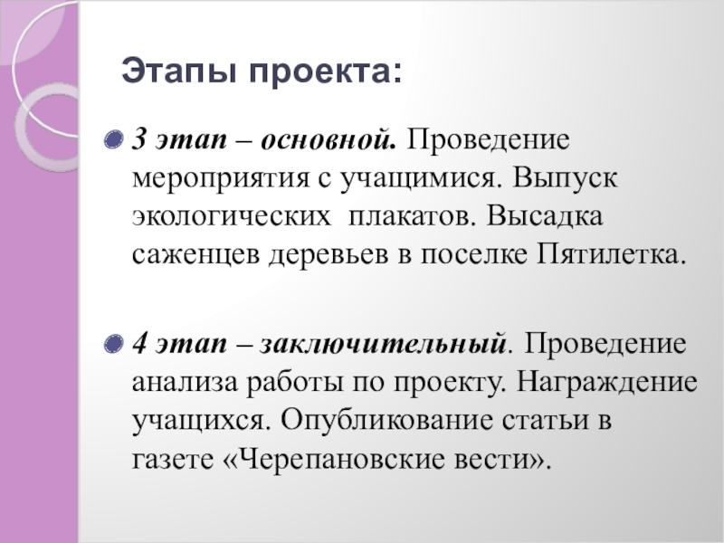 4 этап – заключительный. Проведение анализа работы по проекту. Награждение учащихся. Опубликование статьи в газете «Черепановские вести».