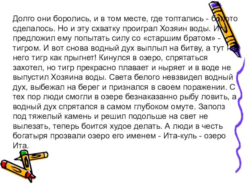 сделалось. Но и эту схватку проиграл Хозяин воды. Ита предложил ему попытать силу со «старшим братом» - тигром. И вот снова водный дух выплыл на битву, а тут на него тигр как прыгнет! Кинулся в озеро, спрятаться захотел, но тигр прекрасно плавает и ныряет и в воде не выпустил Хозяина воды. Света белого невзвидел водный дух, выбежал на берег и признался в своем поражении. С тех пор люди смогли в озере безнаказанно рыбу ловить, а водный дух спрятался в самом глубоком омуте. Заполз под тяжелый камень и решил подольше на свет не вылезать, теперь боится худое делать. А люди в честь богатыря прозвали озеро его именем - Ита-куль - озеро Ита.