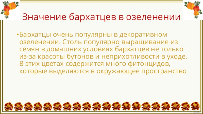 Слайд 4Значение бархатцев в озеленении