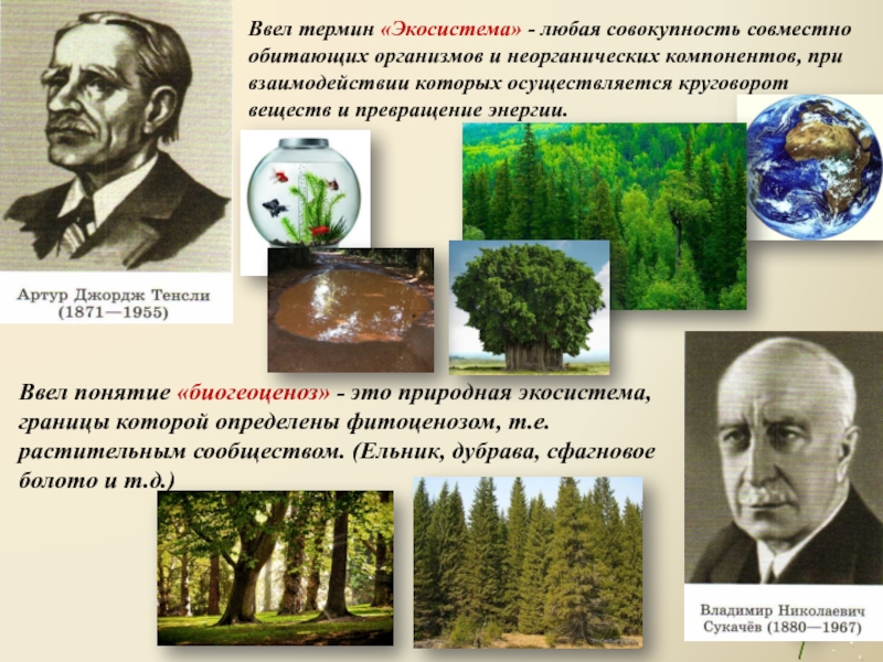 Ввел понятие «биогеоценоз» - это природная экосистема, границы которой определены фитоценозом, т.е. растительным сообществом. (Ельник, дубрава, сфагновое болото и т.д.)