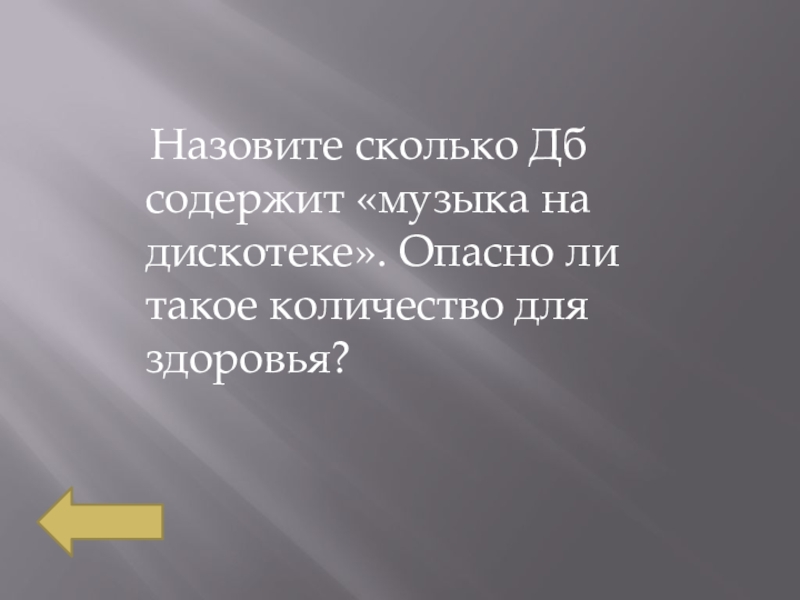 Слайд 14 Назовите сколько Дб содержит «музыка на дискотеке». Опасно ли такое