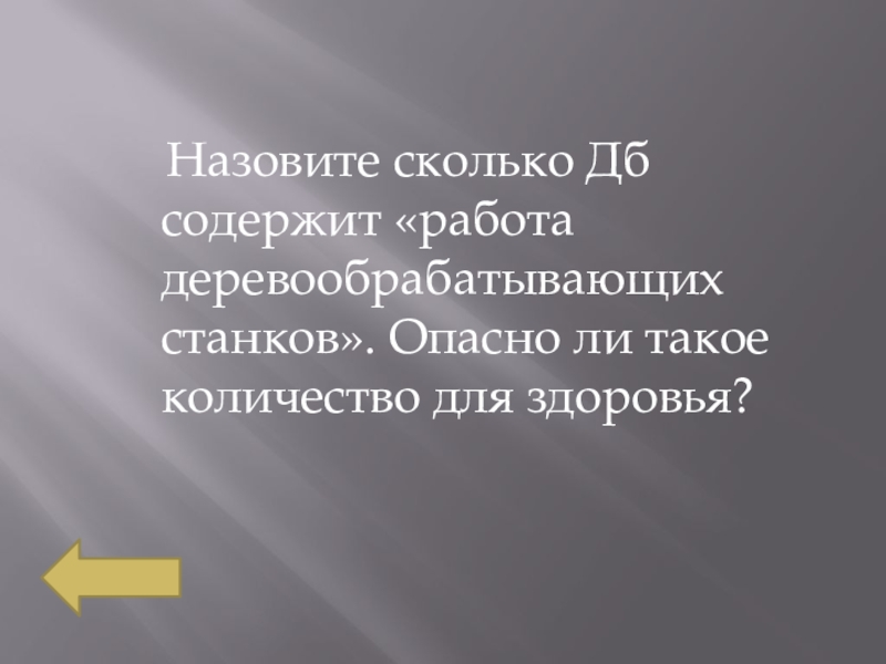 Слайд 11 Назовите сколько Дб содержит «работа деревообрабатывающих станков». Опасно ли такое