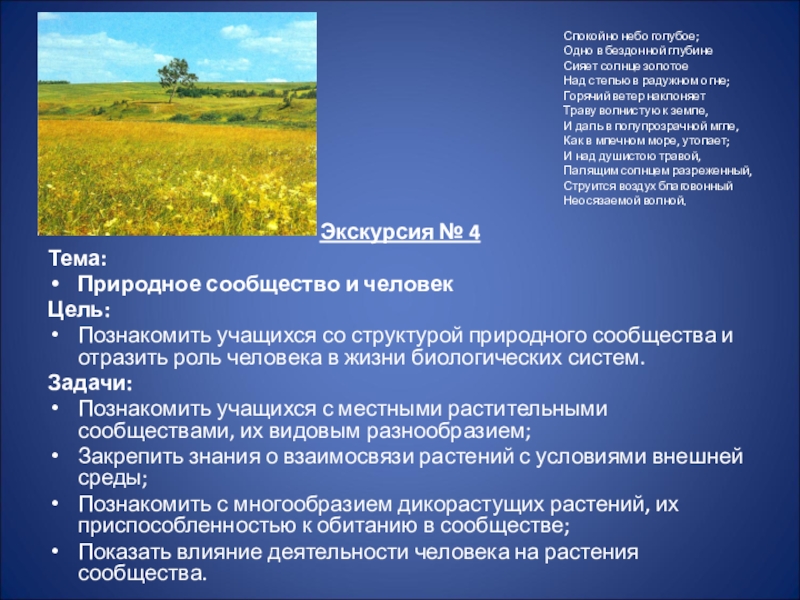Познакомить учащихся со структурой природного сообщества и отразить роль человека в жизни биологических систем.