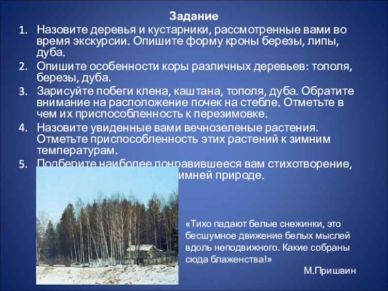 Назовите деревья и кустарники, рассмотренные вами во время экскурсии. Опишите форму кроны березы, липы, дуба.
