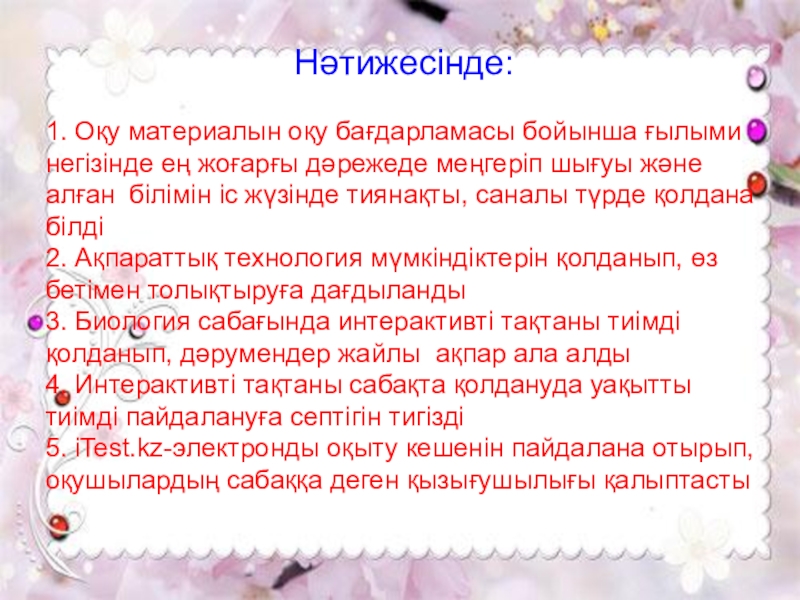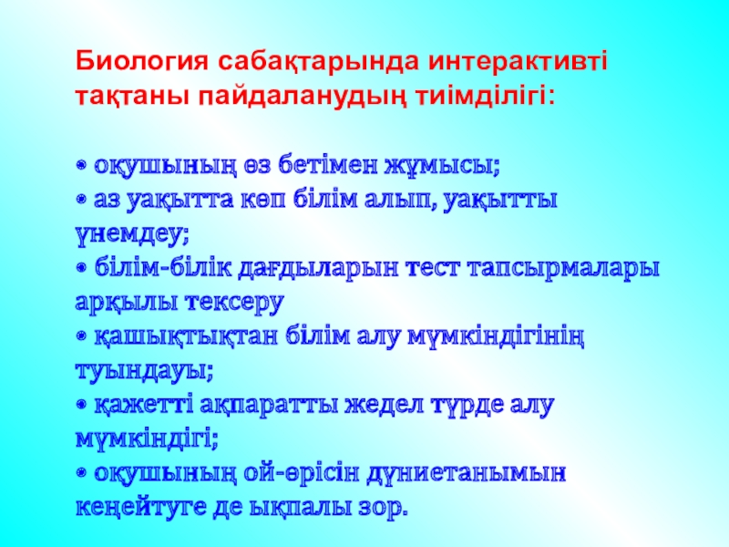Слайд 8Биология сабақтарында интерактивті тақтаны пайдаланудың тиімділігі: