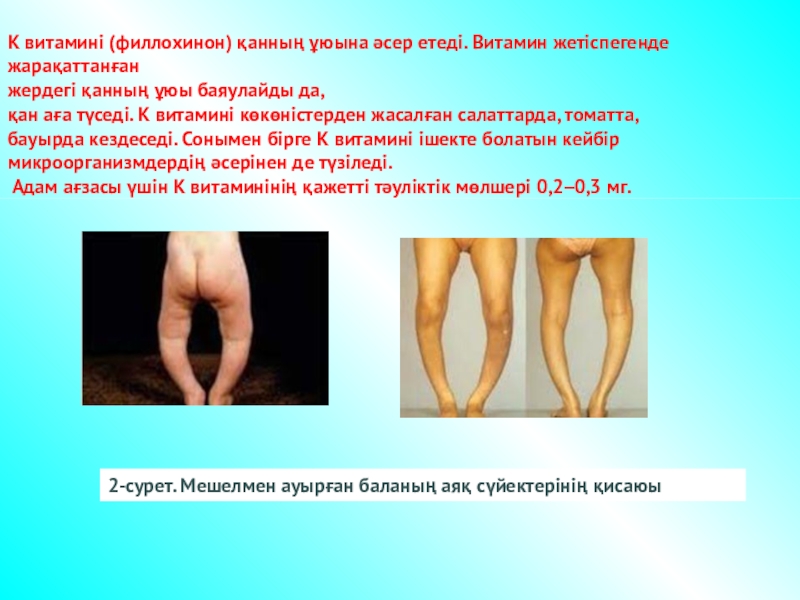 Слайд 20К витамині (филлохинон) қанның ұюына әсер етеді. Витамин жетіспегенде жарақаттанған