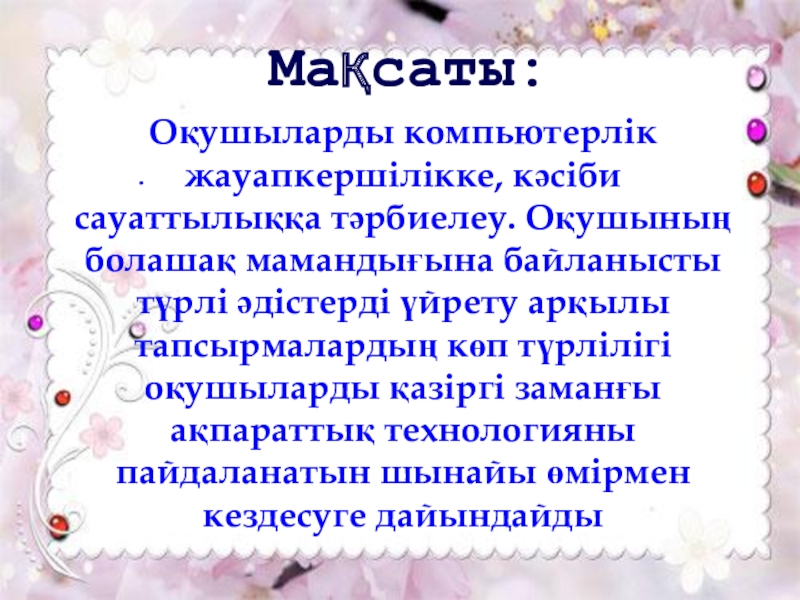 Оқушыларды компьютерлік жауапкершілікке, кәсіби сауаттылыққа тәрбиелеу. Оқушының болашақ мамандығына байланысты түрлі
