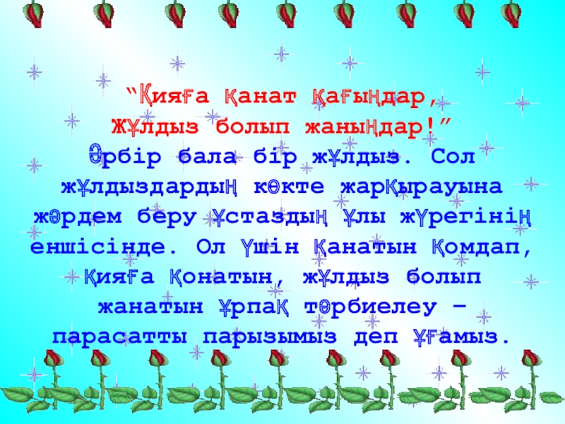жарқырауына жәрдем беру ұстаздың ұлы жүрегінің еншісінде. Ол үшін қанатын қомдап, қияға қонатын, жұлдыз болып жанатын ұрпақ тәрбиелеу – парасатты парызымыз деп ұғамыз.