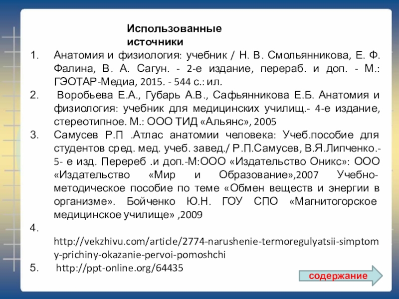 Самусев Р.П .Атлас анатомии человека: Учеб.пособие для студентов сред. мед. учеб. завед./ Р.П.Самусев, В.Я.Липченко.- 5- е изд. Перереб .и доп.-М:ООО «Издательство Оникс»: ООО «Издательство «Мир и Образование»,2007 Учебно- методическое пособие по теме «Обмен веществ и энергии в организме». Бойченко Ю.Н. ГОУ СПО «Магнитогорское медицинское училище» ,2009