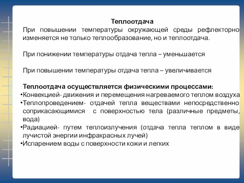 Конвекция, теплоизлучение, через кожу, ЖКТ, при дыхании