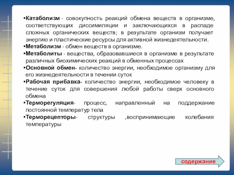 Слайд 72Катаболизм - совокупность реакций обмена веществ в организме, соответствующих диссимиляции и заключающихся