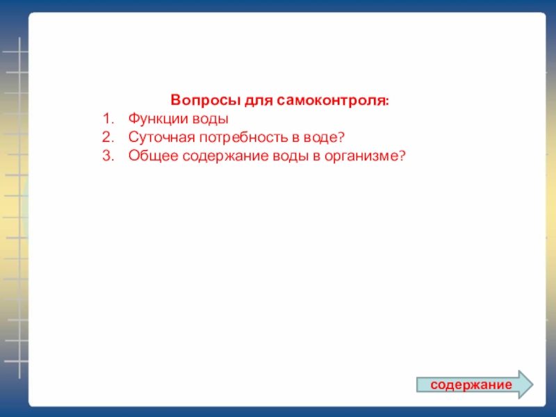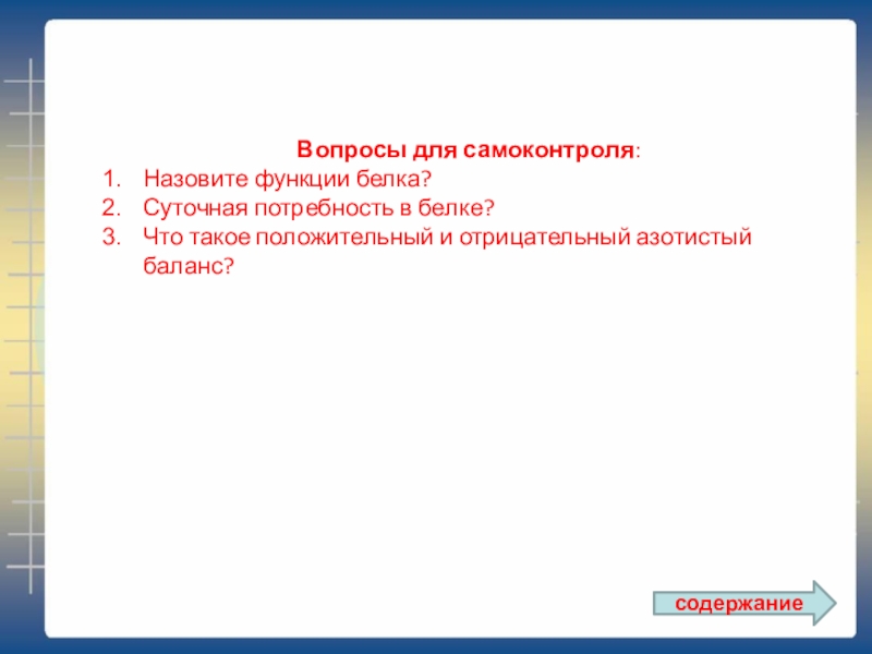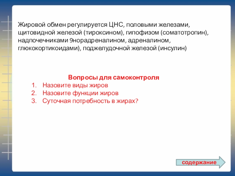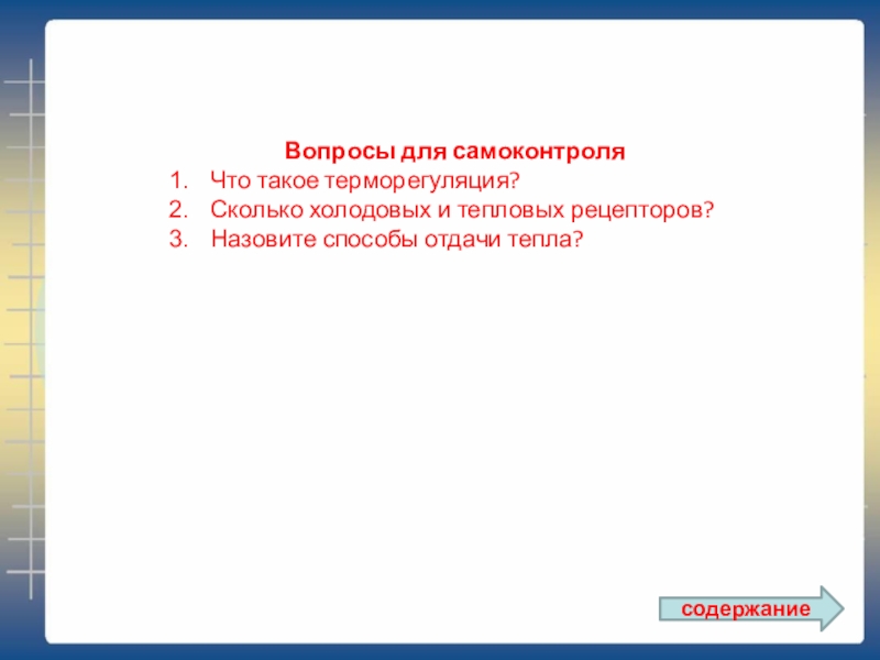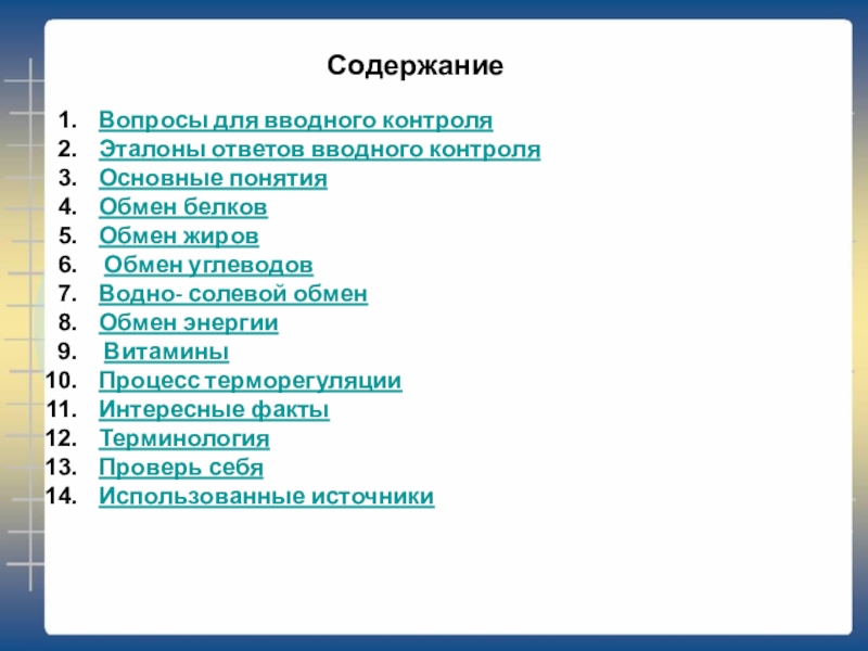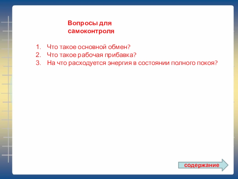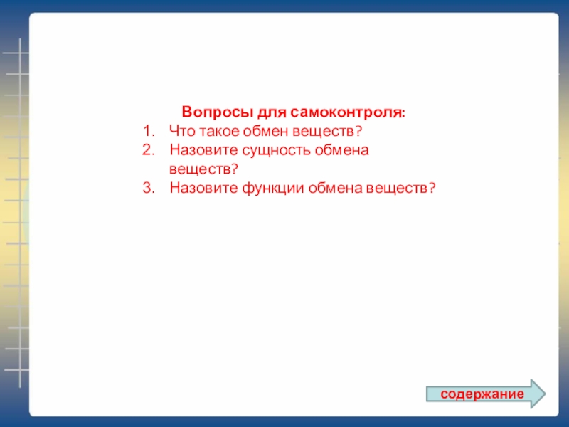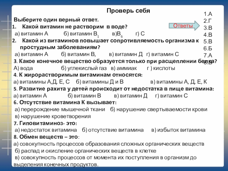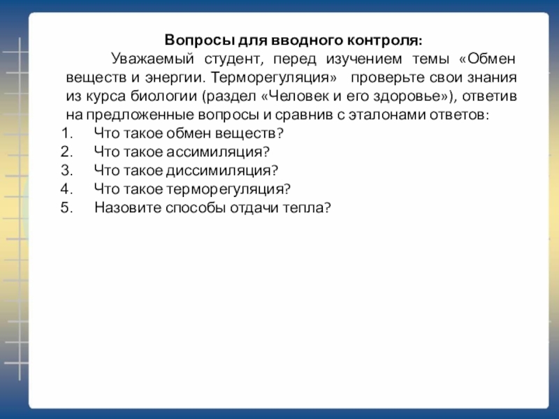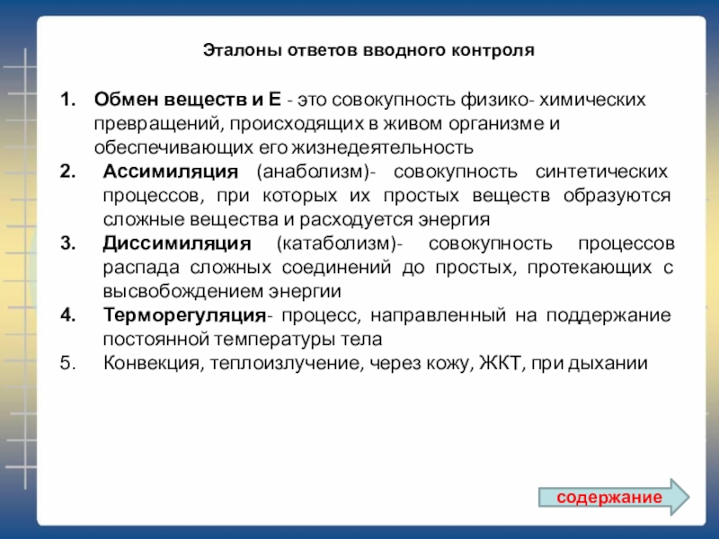 «Обмен веществ и энергии. Терморегуляция» проверьте свои знания из курса биологии (раздел «Человек и его здоровье»), ответив на предложенные вопросы и сравнив с эталонами ответов: