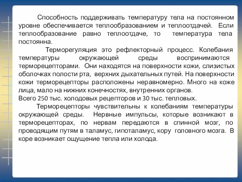 Терморегуляция это рефлекторный процесс. Колебания температуры окружающей среды воспринимаются терморецепторами. Они находятся на поверхности кожи, слизистых оболочках полости рта, верхних дыхательных путей. На поверхности кожи терморецепторы расположены неравномерно. Много на коже лица, мало на нижних конечностях, внутренних органов.