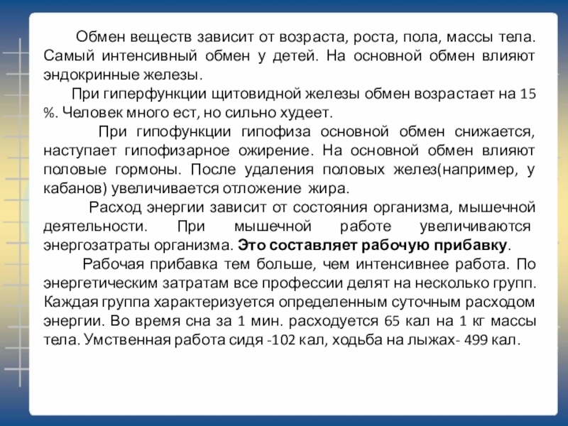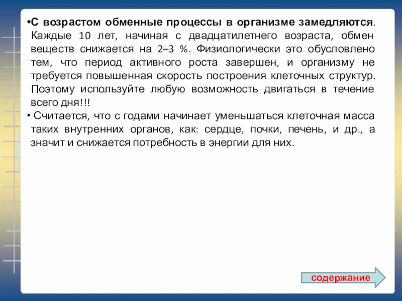 Слайд 70С возрастом обменные процессы в организме замедляются. Каждые 10 лет, начиная