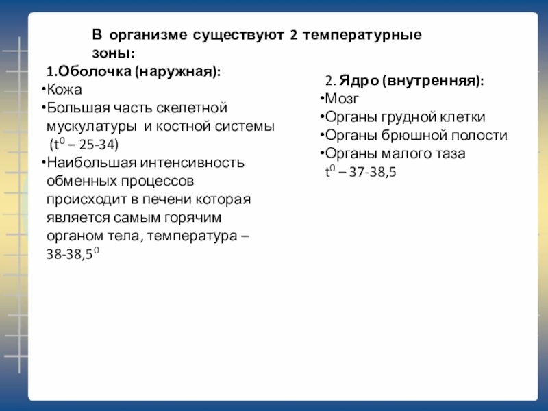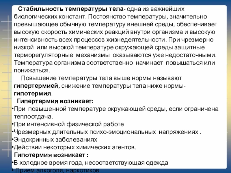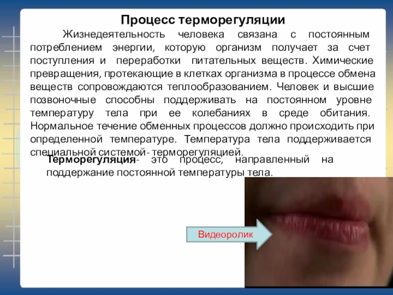 Терморегуляция- процесс, направленный на поддержание постоянной температур тела
