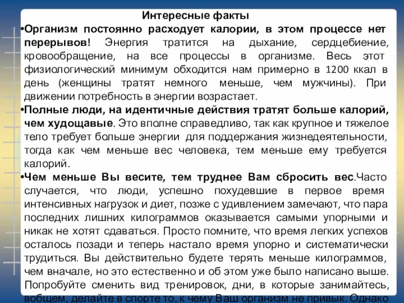 Чем меньше Вы весите, тем труднее Вам сбросить вес.Часто случается, что люди, успешно похудевшие в первое время интенсивных нагрузок и диет, позже с удивлением замечают, что пара последних лишних килограммов оказывается самыми упорными и никак не хотят сдаваться. Просто помните, что время легких успехов осталось позади и теперь настало время упорно и систематически трудиться. Вы действительно будете терять меньше килограммов, чем вначале, но это естественно и об этом уже было написано выше. Попробуйте сменить вид тренировок, дни, в которые занимайтесь,вобщем, делайте в спорте то, к чему Ваш организм не привык. Однако не рекомендуется опускать суточную дозу калорий ниже 1200–1500.