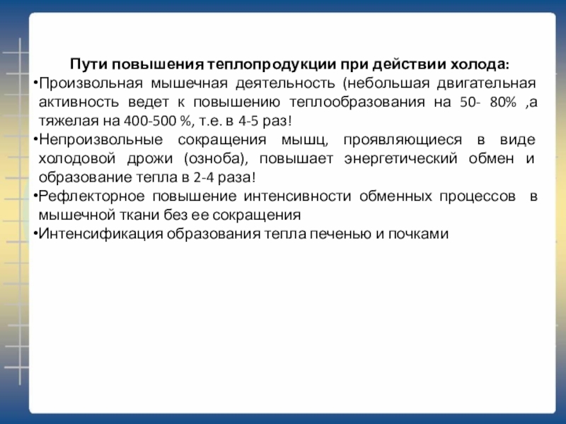 Слайд 64Пути повышения теплопродукции при действии холода: