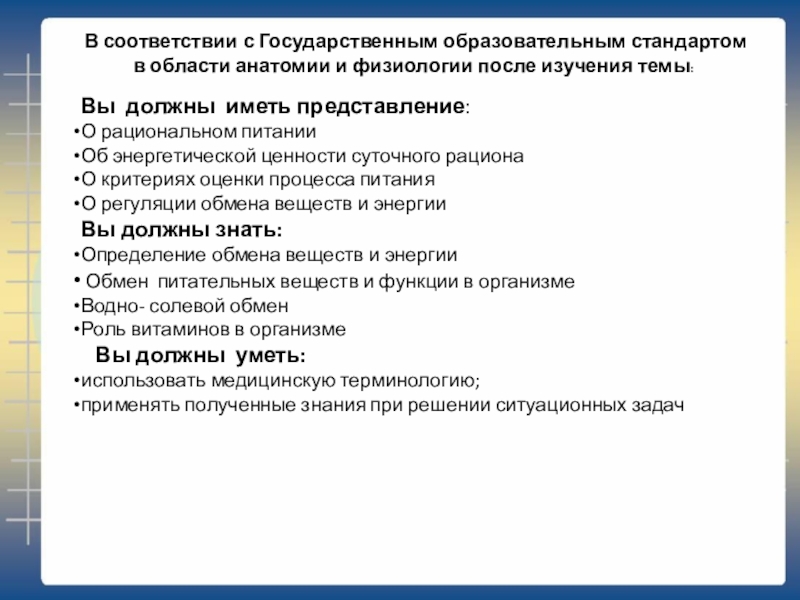 Слайд 6В соответствии с Государственным образовательным стандартом в области анатомии и физиологии