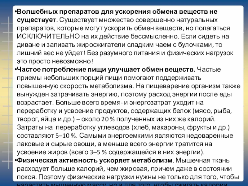 Слайд 69Волшебных препаратов для ускорения обмена веществ не существует. Существует множество совершенно
