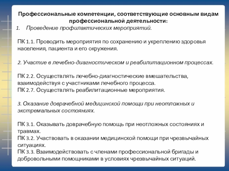 Слайд 5Профессиональные компетенции, соответствующие основным видам профессиональной деятельности: