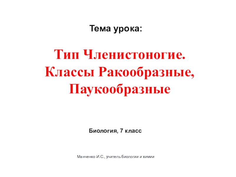 Тип Членистоногие. Классы Ракообразные, ПаукообразныеТема урока:Биология, 7 классМанченко И.С., учитель биологии и химии