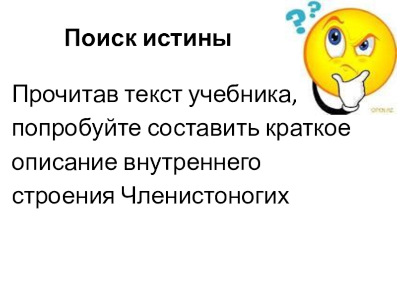 Поиск истиныПрочитав текст учебника,попробуйте составить краткоеописание внутреннего строения Членистоногих