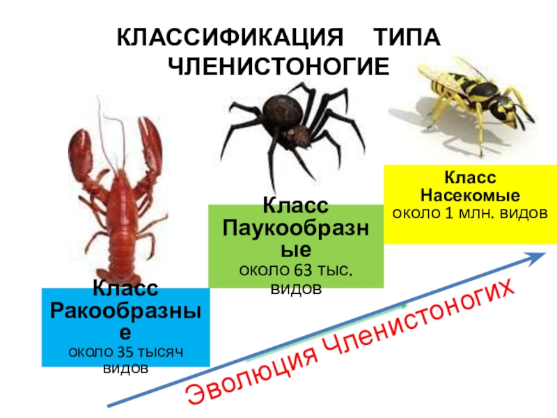 Класс Паукообразныеоколо 63 тыс. видовКласс Ракообразныеоколо 35 тысяч видовКлассНасекомыеоколо 1 млн. видовЭволюция ЧленистоногихКЛАССИФИКАЦИЯ   ТИПА