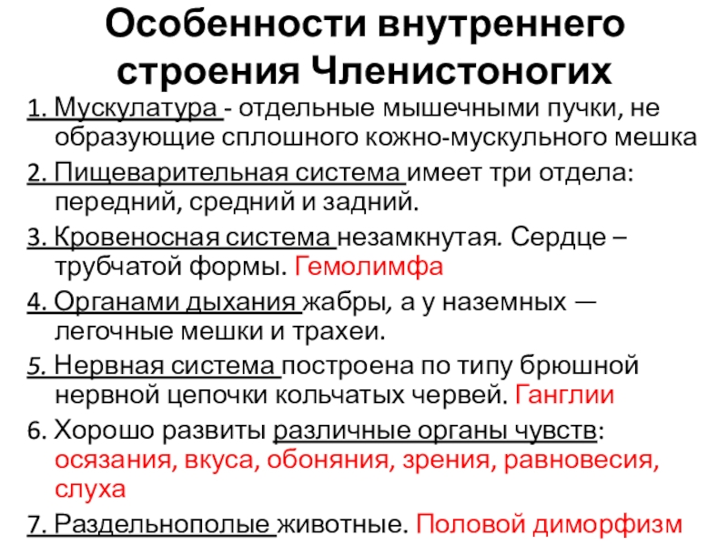 Особенности внутреннего строения Членистоногих1. Мускулатура - отдельные мышечными пучки, не образующие сплошного кожно-мускульного мешка2. Пищеварительная система имеет