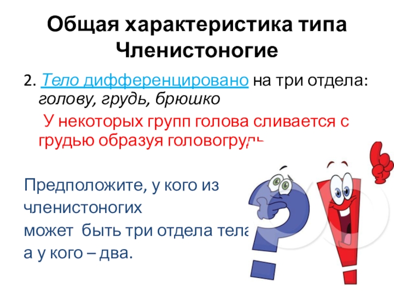 2. Тело дифференцировано на три отдела: голову, грудь, брюшко   У некоторых групп голова сливается с