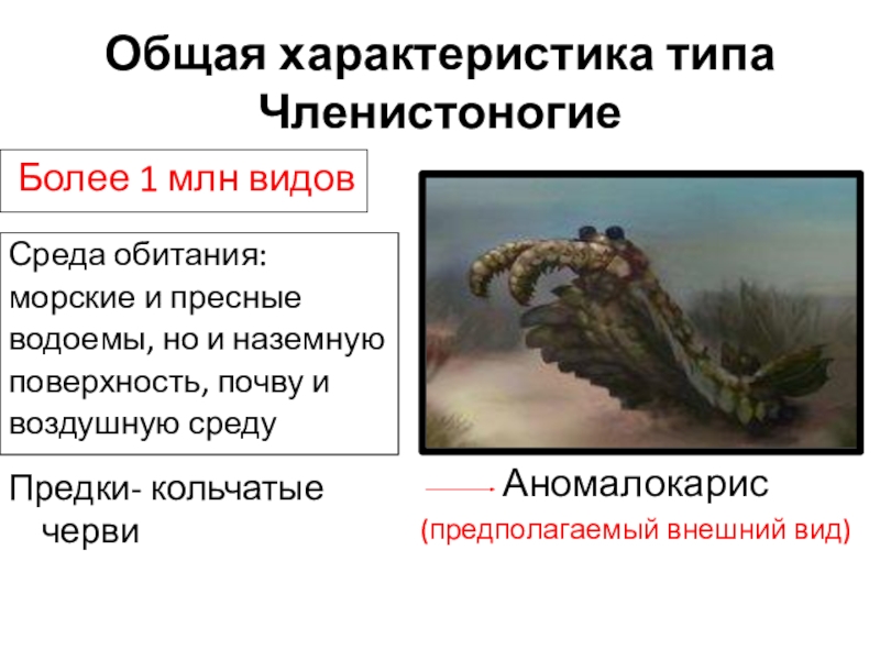 Общая характеристика типа ЧленистоногиеСреда обитания:морские и пресныеводоемы, но и наземнуюповерхность, почву ивоздушную средуАномалокарис(предполагаемый внешний вид) Более 1 млн видовПредки- кольчатые черви