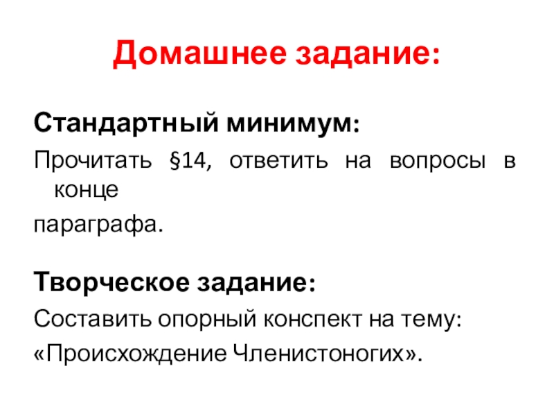 Домашнее задание:Стандартный минимум:Прочитать §14, ответить на вопросы в концепараграфа.Творческое задание:Составить опорный конспект на тему:«Происхождение Членистоногих».