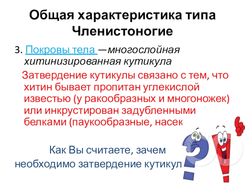 3. Покровы тела —многослойная хитинизированная кутикула  Затвердение кутикулы связано с тем, что хитин бывает пропитан углекислой