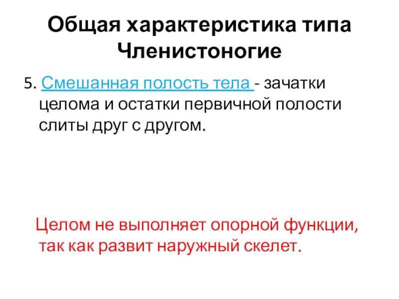 5. Смешанная полость тела - зачатки целома и остатки первичной полости слиты друг с другом.