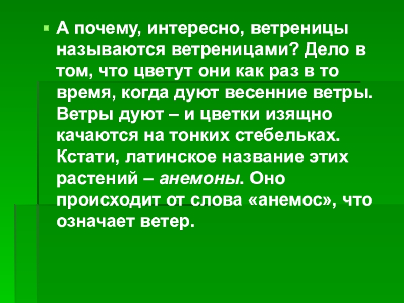 Слайд 14А почему, интересно, ветреницы называются ветреницами? Дело в том, что цветут