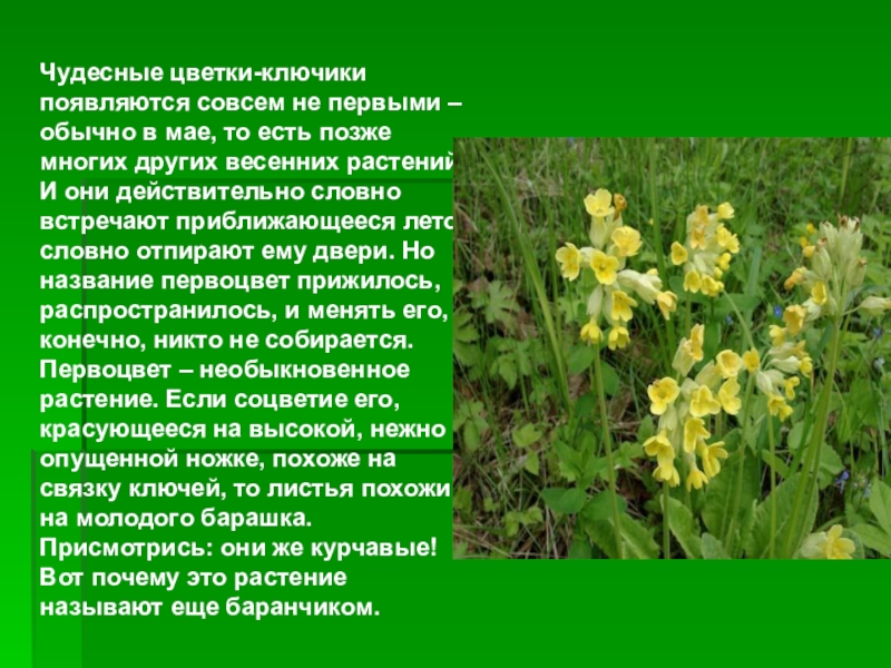 Слайд 16Чудесные цветки-ключики появляются совсем не первыми – обычно в мае, то