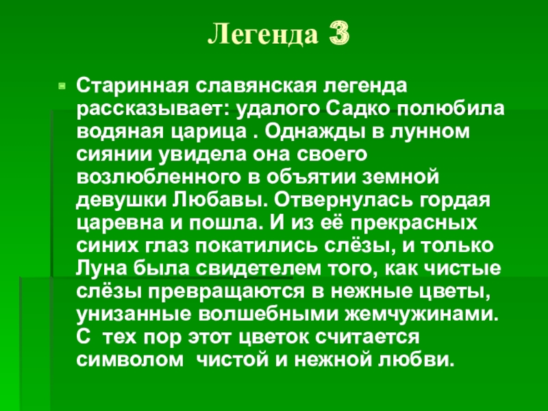 Однажды в лунном сиянии увидела она своего возлюбленного в объятии земной девушки Любавы. Отвернулась гордая царевна и пошла. И из её прекрасных синих глаз покатились слёзы, и только Луна была свидетелем того, как чистые слёзы превращаются в нежные цветы, унизанные волшебными жемчужинами. С тех пор этот цветок считается символом чистой и нежной любви.