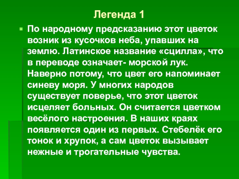 землю. Латинское название «сцилла», что в переводе означает- морской лук. Наверно потому, что цвет его напоминает синеву моря. У многих народов существует поверье, что этот цветок исцеляет больных. Он считается цветком весёлого настроения. В наших краях появляется один из первых. Стебелёк его тонок и хрупок, а сам цветок вызывает нежные и трогательные чувства.