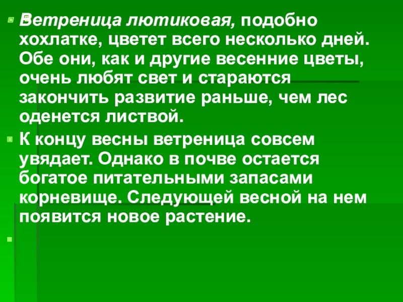 К концу весны ветреница совсем увядает. Однако в почве остается богатое питательными запасами корневище. Следующей весной на нем появится новое растение.