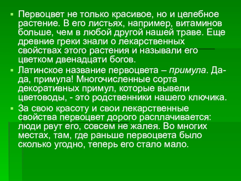 За свою красоту и свои лекарственные свойства первоцвет дорого расплачивается: люди рвут его, совсем не жалея. Во многих местах, там, где раньше первоцвета было сколько угодно, теперь его стало мало.