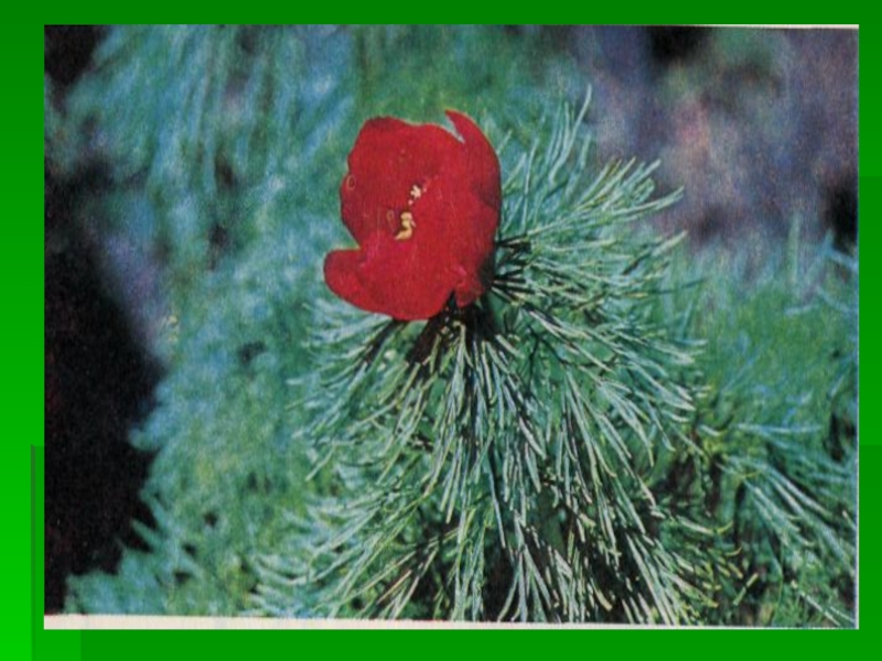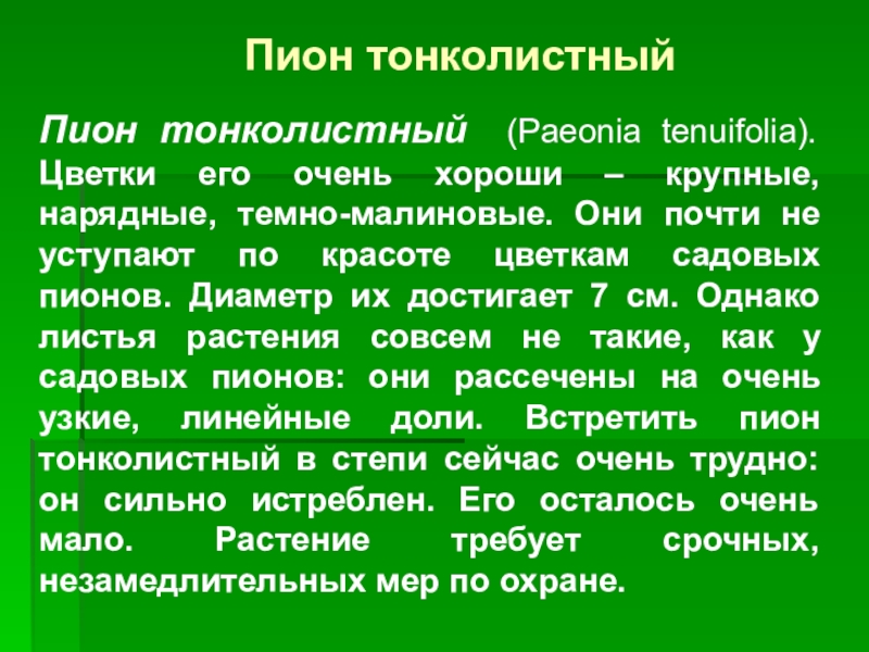 нарядные, темно-малиновые. Они почти не уступают по красоте цветкам садовых пионов. Диаметр их достигает 7 см. Однако листья растения совсем не такие, как у садовых пионов: они рассечены на очень узкие, линейные доли. Встретить пион тонколистный в степи сейчас очень трудно: он сильно истреблен. Его осталось очень мало. Растение требует срочных, незамедлительных мер по охране.