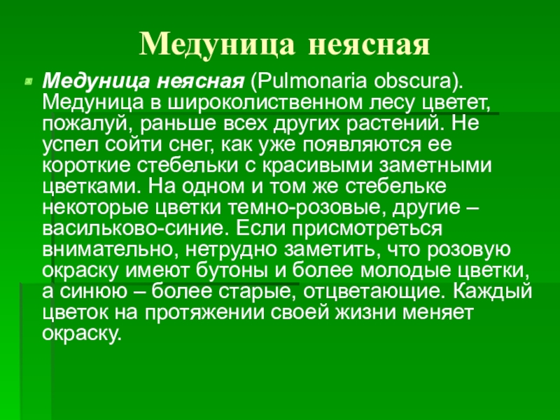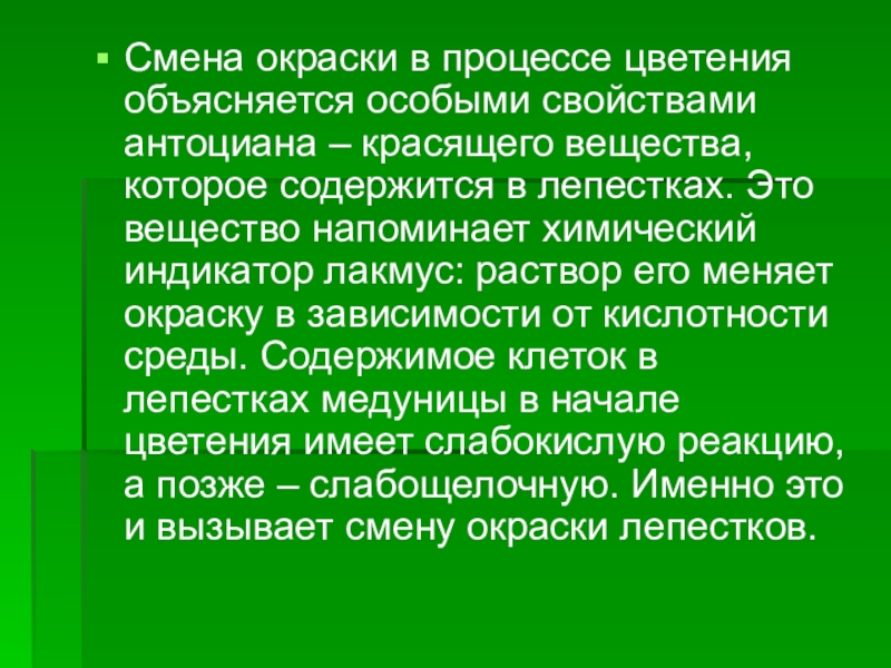 вещества, которое содержится в лепестках. Это вещество напоминает химический индикатор лакмус: раствор его меняет окраску в зависимости от кислотности среды. Содержимое клеток в лепестках медуницы в начале цветения имеет слабокислую реакцию, а позже – слабощелочную. Именно это и вызывает смену окраски лепестков.