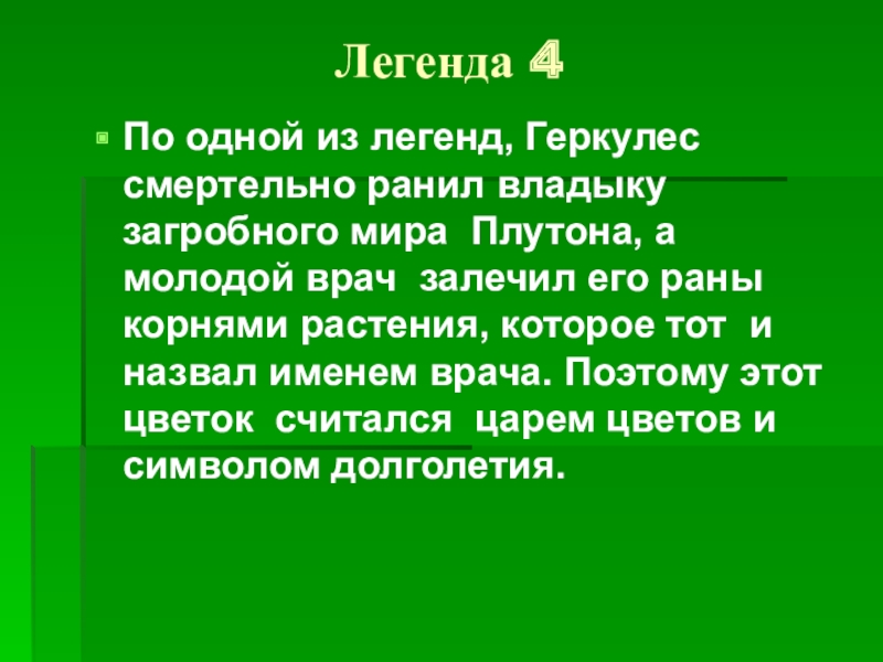 Плутона, а молодой врач залечил его раны корнями растения, которое тот и назвал именем врача. Поэтому этот цветок считался царем цветов и символом долголетия.