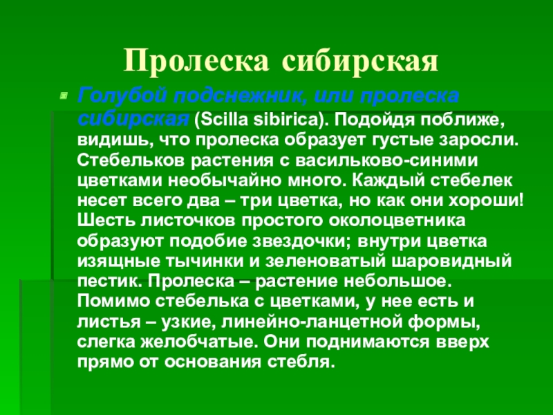 что пролеска образует густые заросли. Стебельков растения с васильково-синими цветками необычайно много. Каждый стебелек несет всего два – три цветка, но как они хороши! Шесть листочков простого околоцветника образуют подобие звездочки; внутри цветка изящные тычинки и зеленоватый шаровидный пестик. Пролеска – растение небольшое. Помимо стебелька с цветками, у нее есть и листья – узкие, линейно-ланцетной формы, слегка желобчатые. Они поднимаются вверх прямо от основания стебля.