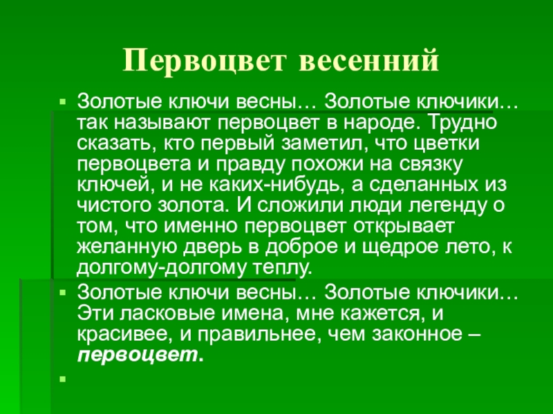 Трудно сказать, кто первый заметил, что цветки первоцвета и правду похожи на связку ключей, и не каких-нибудь, а сделанных из чистого золота. И сложили люди легенду о том, что именно первоцвет открывает желанную дверь в доброе и щедрое лето, к долгому-долгому теплу.