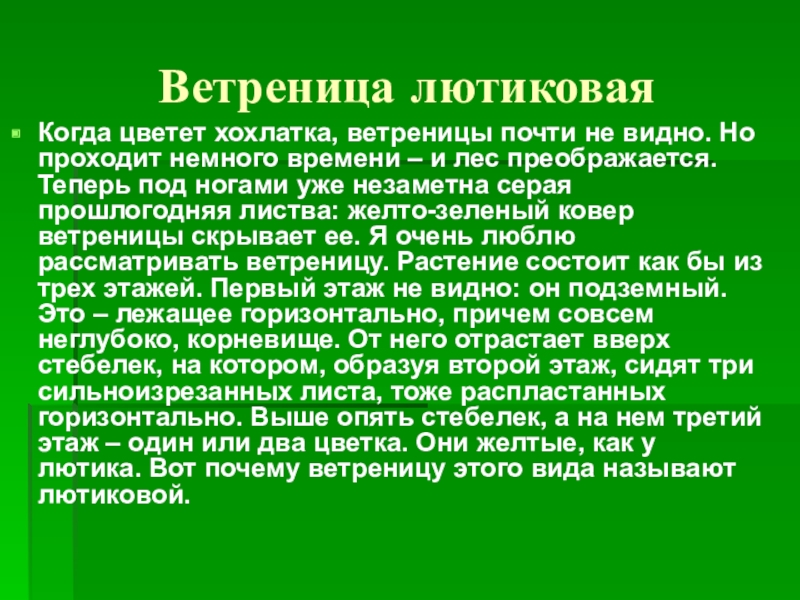 времени – и лес преображается. Теперь под ногами уже незаметна серая прошлогодняя листва: желто-зеленый ковер ветреницы скрывает ее. Я очень люблю рассматривать ветреницу. Растение состоит как бы из трех этажей. Первый этаж не видно: он подземный. Это – лежащее горизонтально, причем совсем неглубоко, корневище. От него отрастает вверх стебелек, на котором, образуя второй этаж, сидят три сильноизрезанных листа, тоже распластанных горизонтально. Выше опять стебелек, а на нем третий этаж – один или два цветка. Они желтые, как у лютика. Вот почему ветреницу этого вида называют лютиковой.